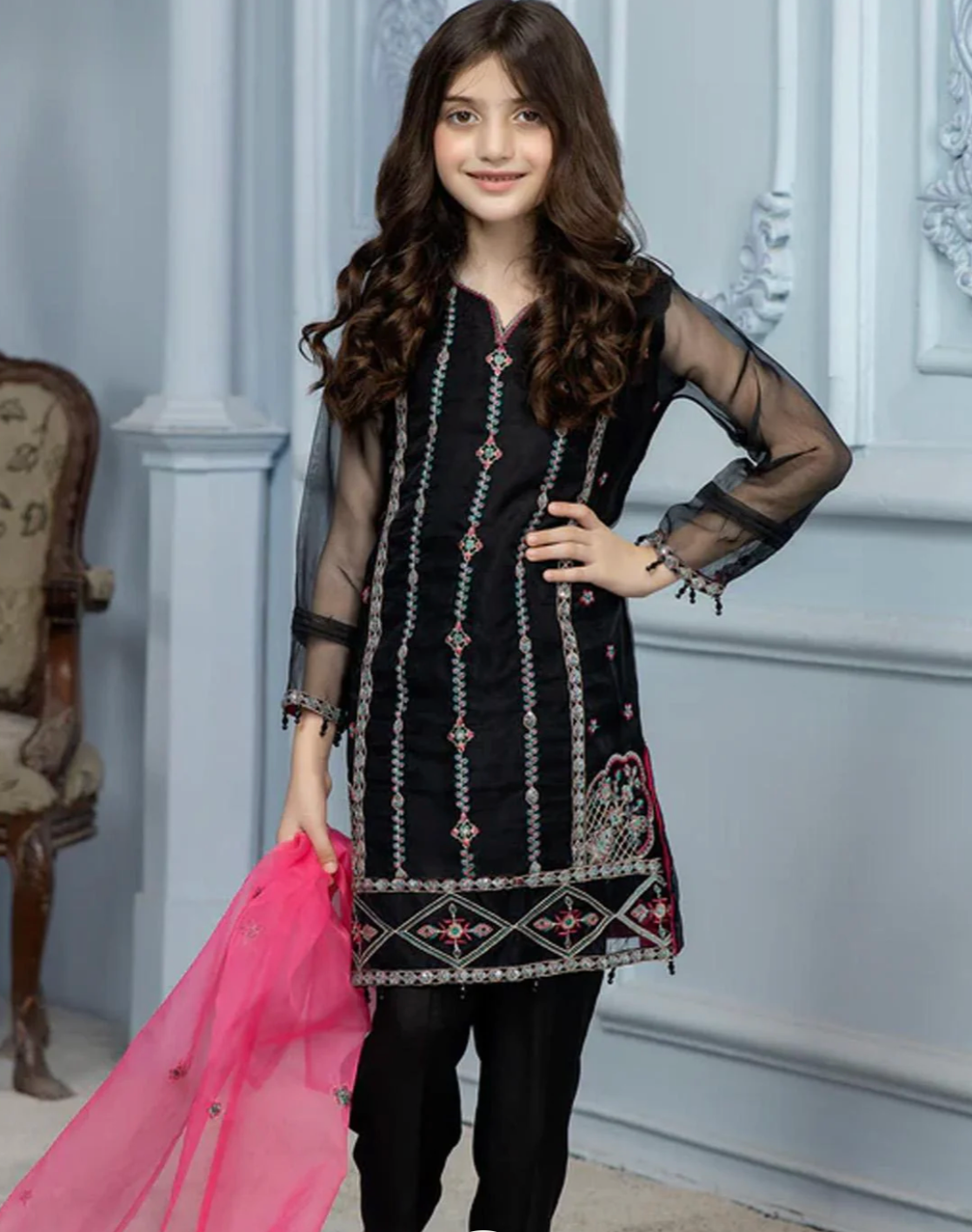 Black - Girl's Kurta and Dupatta